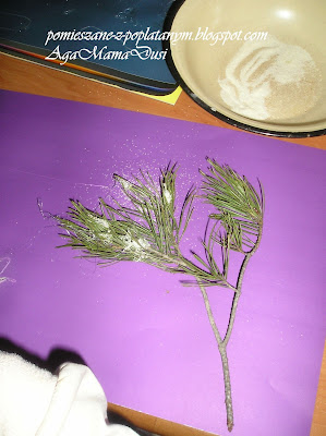 Bazą do naszej pracy była gałązka przytargana z lasu oraz kilka badylków ze świerku rosnącego w naszym ogródku. Pierwotnie planowałyśmy "ośnieżyć" je używając kleju Vicol i kaszy manny ale jak się okazało to co było w tubce totalnie zaschło. No ale me genialne Dziecko, pamiętając chyba ostatnie malowanie klejem na gorąco KLIK podsunęło myśl, że tym razem też możemy go wykorzystać. Pomysł okazał się bardzo dobry :D